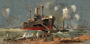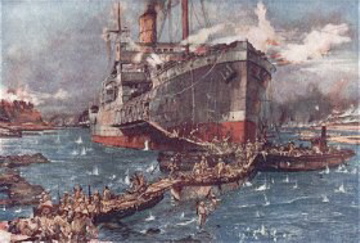 During the war he was placed in command of the SS River Clyde, an old collier, which had been adapted to land 2,000 troops straight onto ‘V’ Beach at Gallipoli. Eight ports were fitted in the ship’s side level with the interior decks through which sloping gangways could be run out to facilitate speedy landing. Barges were made fast to her port side that could be used to form a floating bridge if she grounded too far out. When the ship grounded a hopper on the starboard side would manoeuvre to bridge the gap between ship and shore. 25 small boats were secured alongside, packed with soldiers who were to land first and cover the main disembarkation. V Beach was a natural amphitheater with perpendicular cliffs on one side and the castle and village of Seddul-Bahr on the other. The beach was steep and covered with barbed wire entanglements to below low watermark. Large numbers of Turkish troops were well dug in around the beach. It was expected to be a very difficult and costly undertaking; probably the most dangerous of all the planned landing beaches. Captain Unwin beached the River Clyde as planned but the hopper became stuck. He quickly realised that it could not be positioned in time to be of use so he went down into the lighters which had shot ahead as the ship lurched to a halt. He took a line from one of them and swam ashore where he hauled the lighters towards him, assisted by Seaman Williams who had followed him. Standing up to their shoulders in water they were fully exposed to exceptionally heavy rifle and machine-gun fire from the Turks and became obvious targets. It is said that for some hours 10,000 shots a minute fell in or close to the River Clyde. Against the odds they managed to establish a connection with the shore. The army brigade diary records: “Thanks to the extraordinary gallantry displayed by the naval party, the barges were got into some sort of position” As Unwin and Williams held the line taught, the soldiers swarmed forward but under unrelenting, withering fire few got ashore. The sea was soon crimson and awash with bodies. After about 40 minutes Williams was shot and collapsed into Unwin’s arms. Holding him up so he did not drown Unwin relinquished the rope to other sailors finally coming to their assistance. Unwin was 51, exhausted and frozen from the strain of holding the heavy barges whilst all but submerged in the sea, surrounded by death and destruction, but he got Williams to safety. Unwin returned to the ship himself needing urgent medical treatment for a heart complaint. For an hour, doctors tried to get his heart to work normally but against doctors’ orders he decided to go down into the hopper to try and improve the connection with the shore. Unwin was wounded by bullet splinters in the face and was forced to return to the ship for further treatment. He then took to a ship’s lifeboat and still under heavy fire began rescuing wounded men lying in the shallows. He continued until he collapsed through physical exhaustion.