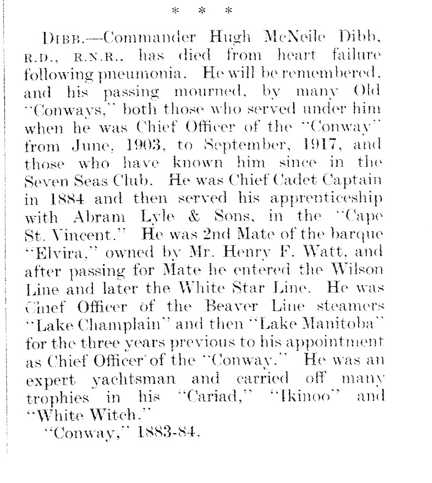 In 1888 he was appointed Chief Officer of the Conway, having served in her as Nile.
