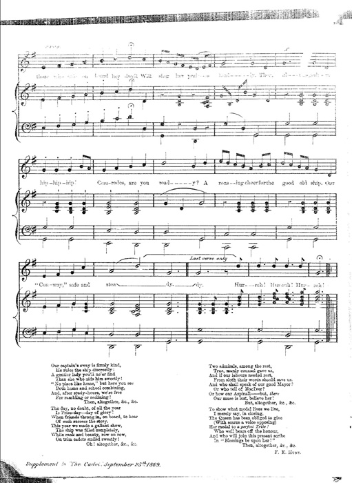The Third (& Last) Conway Song In 1918 for reasons not explained the second song was no longer sung. The Cadet magazine reported that several attempts had been made to create a new song but that these had all faltered. John Masefield apparently wrote a set of words but these were not used. They may be the words for the second song reproduced above. Mr Cecil Roberts (Literary Editor at the Liverpool Post and a well kown author) visited the Ship in 1916 to read his Sea Ballads and was invited to write a new Conway song. He produced the words three day later but did not feel up to the job of setting them to music. He invited Miss Muriel Herbert to do this and her efforts were judged by the Cadet magazine to be "... beyond praise ... it voices the very spirit of the sea ... its rollicking lilt and crashing chords carry all before them". On 1st December 1916 she and Roberts visited the Ship and she sang the song to the staff and cadets. They obviously liked it as she "received an ovation". The third song was sung until the closure and is still "sung" today at gatherings of OCs. The words are below: The sheet music for the second song is on the following pages: